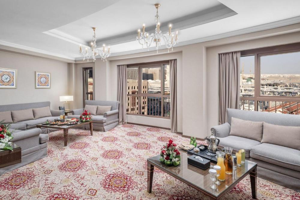 Guest of Royal Suite are granted exclusive access to our sleek and contemporary Arabic style Executive Club Lounge, located on the 10th floor with a spacious, tasteful arrangement encompasses central lounge seating as well as smaller clusters of chairs and coffee tables, while pairs of armchairs and small tables . The thoughtful layout consists of partially separated relaxing and leisure areas perfect for gathering with a small group, including a 52-inch flat screen TV. Amenities and services include: •Complimentary wireless High Speed Internet Access throughout. •Daily Housekeeping Turndown services •Valet parking service •Speed check-in and check-out